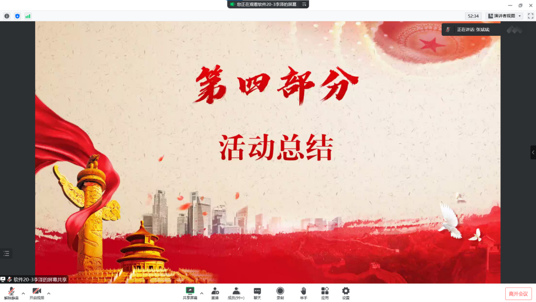 会议开始,首先由软件20-3班李泽同学以课件及视频形式进行领学。通过学习,同学们深刻领会了党的二十大主题,了解到十年来在中国特色社会主义推动下我国取得的瞩目成就,并认识到习近平总书记对广大青年的殷切嘱托,立志做有理想、敢担当、能吃苦、肯奋斗的新时代好青年。