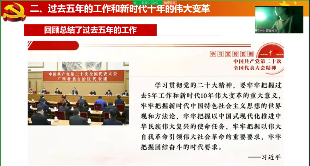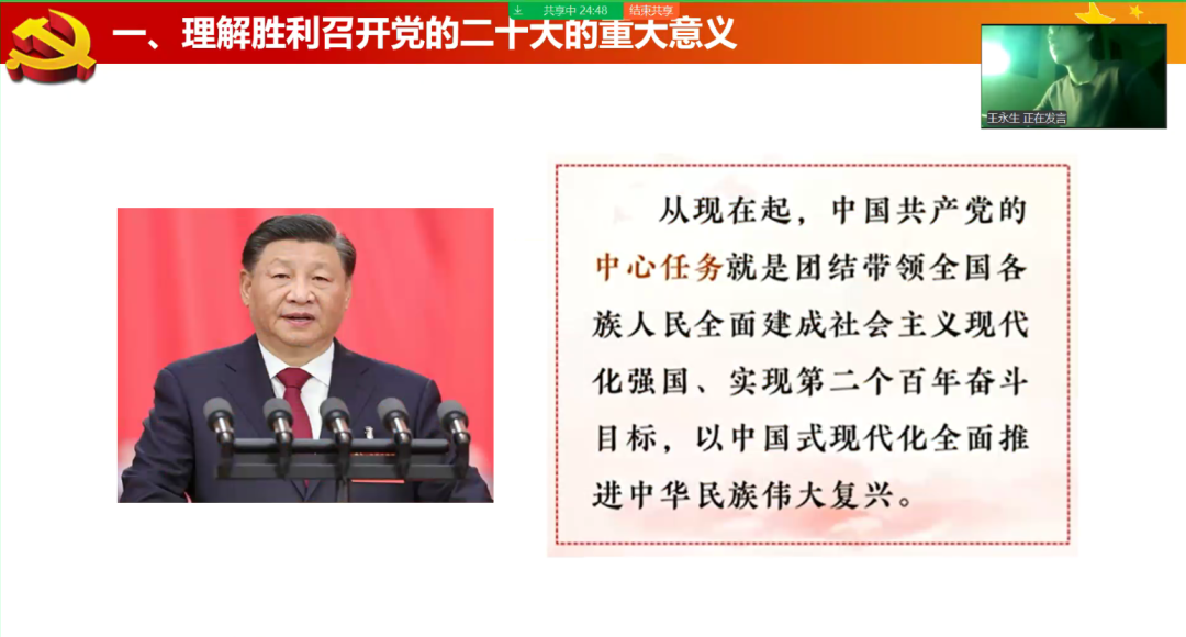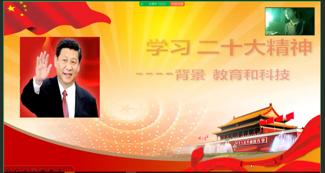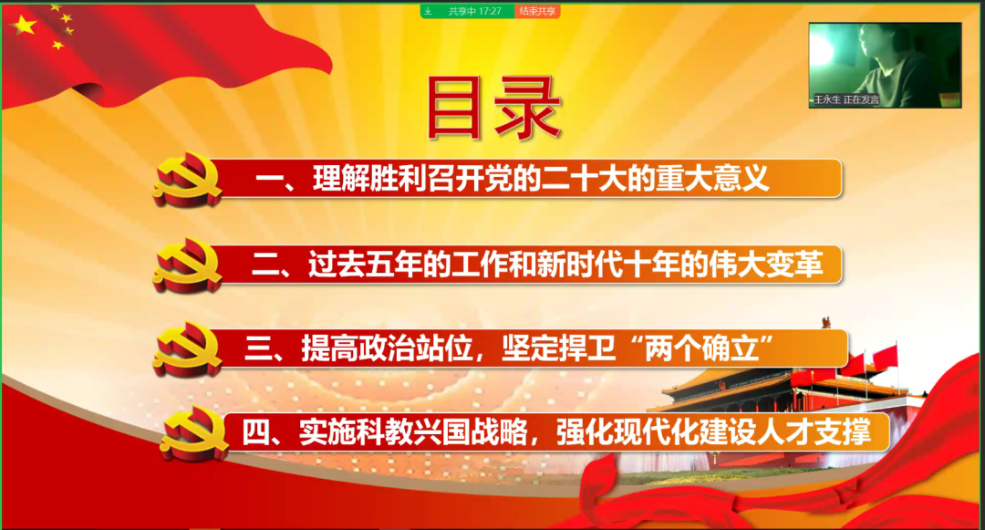 为做好公司党员发展工作,加强对发展对象的培养、考察和教育,提升发展党员质量。11月27日晚7:00,公司党委利用腾讯会议平台在线上举行第十期发展对象党校培训班第三讲。本次党课由党委副书记、副经理王永生主讲,主题为《学习党的二十大精神--背景,教育和科技》。