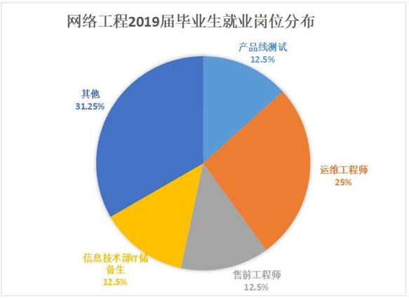 毕业生就业岗位的变化反应市场需求的变化,是专业或培养方案调整的重要依据。从表格上可以看出,网络工程2019届毕业生主要就业岗位为运维工程师,产品线测试以及其他技术支持岗位。