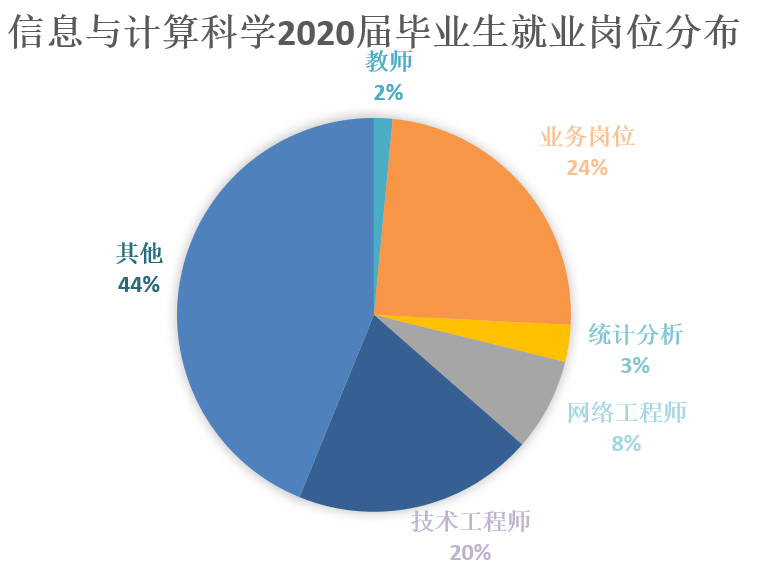 毕业生的就业情况变化反应市场需求的变化,是人才培养和专业发展的重要依据。从图表上来看,信息与计算科学专业2020届毕业生主要就业岗位为业务岗位和技术工程师等技术支持岗位。