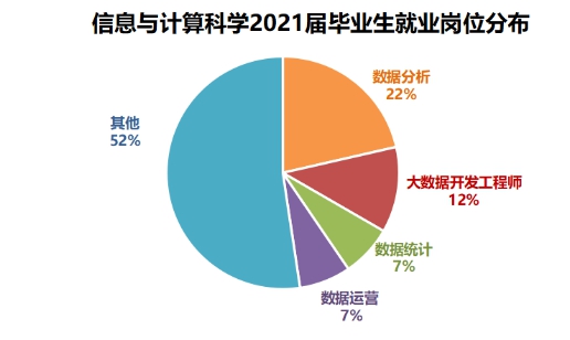 从就业岗位分布图中可以看出,2021届信息与计算科学专业毕业生主要就业岗位为数据分析和大数据开发工程师等技术支持岗位。