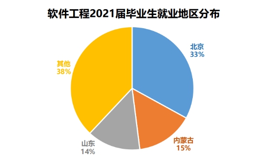 就业地区的选择体现对于人才的需要,经济市场的发展程度。从就业地区分布图中可以看出,2021届软件工程专业毕业生主要选择在北京、内蒙古和山东就业,其中,就业于北京的毕业生占比达33%。