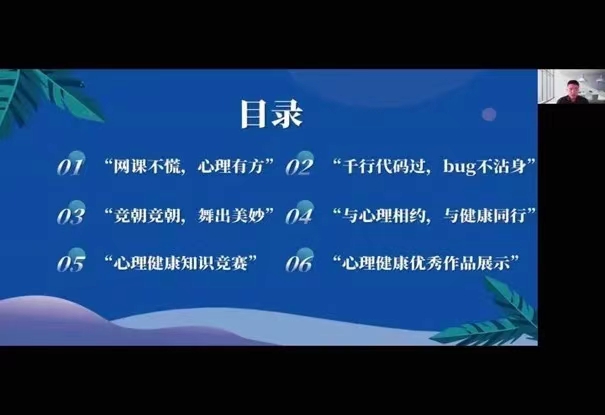 心理健康知识竞赛点燃了激烈的竞争氛围,同学们运用自己相关的心理学知识,踊跃答题,巩固了自己的心理学知识储备。最后由软件21-1的武多多同学带来了视频《偶尔向生活请假》。视频幽默风趣,和大多数处于网课生活的同学状况基本类似,引起了大多数同学的共鸣。