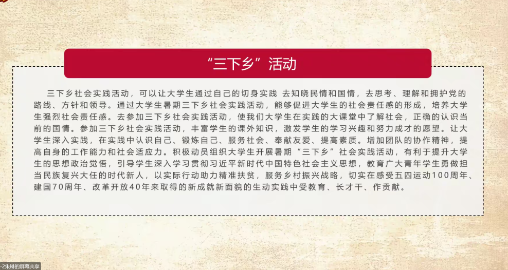 活动开始后,朱琳同学首先介绍了与会嘉宾和“三下乡”活动的意义,总结了本次“三下乡”实践活动取得的丰硕成果,肯定了志愿者们付出的努力。