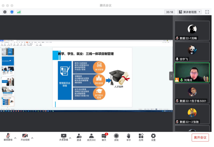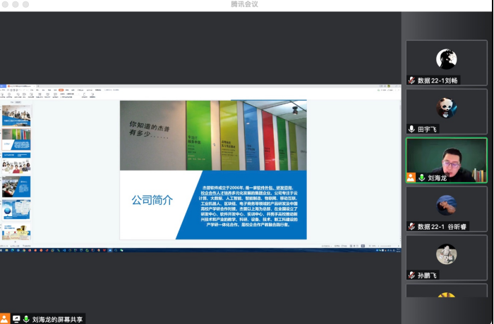 会议伊始,刘海龙老师为同学们介绍了杰普有限公司现状以及公司以人才培养为中心的发展策略,“产教深度融合作、校企协同育人“,将产业的生产、研发、技术等转化为知识与实践要素。在杰普基地期间基地为员工提供求职调研,未来规划、职业方向等实践教育,充分对接企业行业的岗位需求。杰普提出:共享型实训基地、整合资源优势互补原则,采取‘企业项目制’等管理,让我们生活在杰普中,从实践中获得知识,以亲身实践去体会公司特色。使同学们对公司以及所学大数据专业未来的就业前景有了更深入的了解。