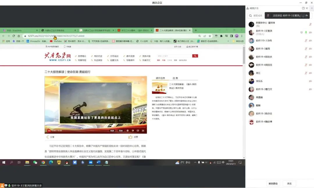 为深刻学习领会党的二十大精神,高水平开好2022年度党支部组织生活会和开展民主评议党员工作,3月11日晚7:00,公司员工党支部在能动大楼204会议室通过线上线下相结合的方式开展党支部生活会前第二次专题学习。