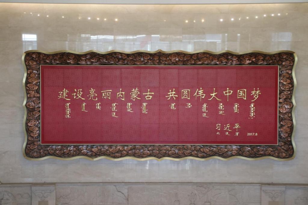 进入博物馆内,满满的历史文化气息扑面而来,迎面是巨大的主题雕塑和“建设亮丽内蒙古,共圆伟大中国梦”牌匾;后方是观影区,在立体的屏幕上,播放着介绍内蒙古自然和人文风光的影片,让同学们可以身临其境的感受这片神秘的土地。