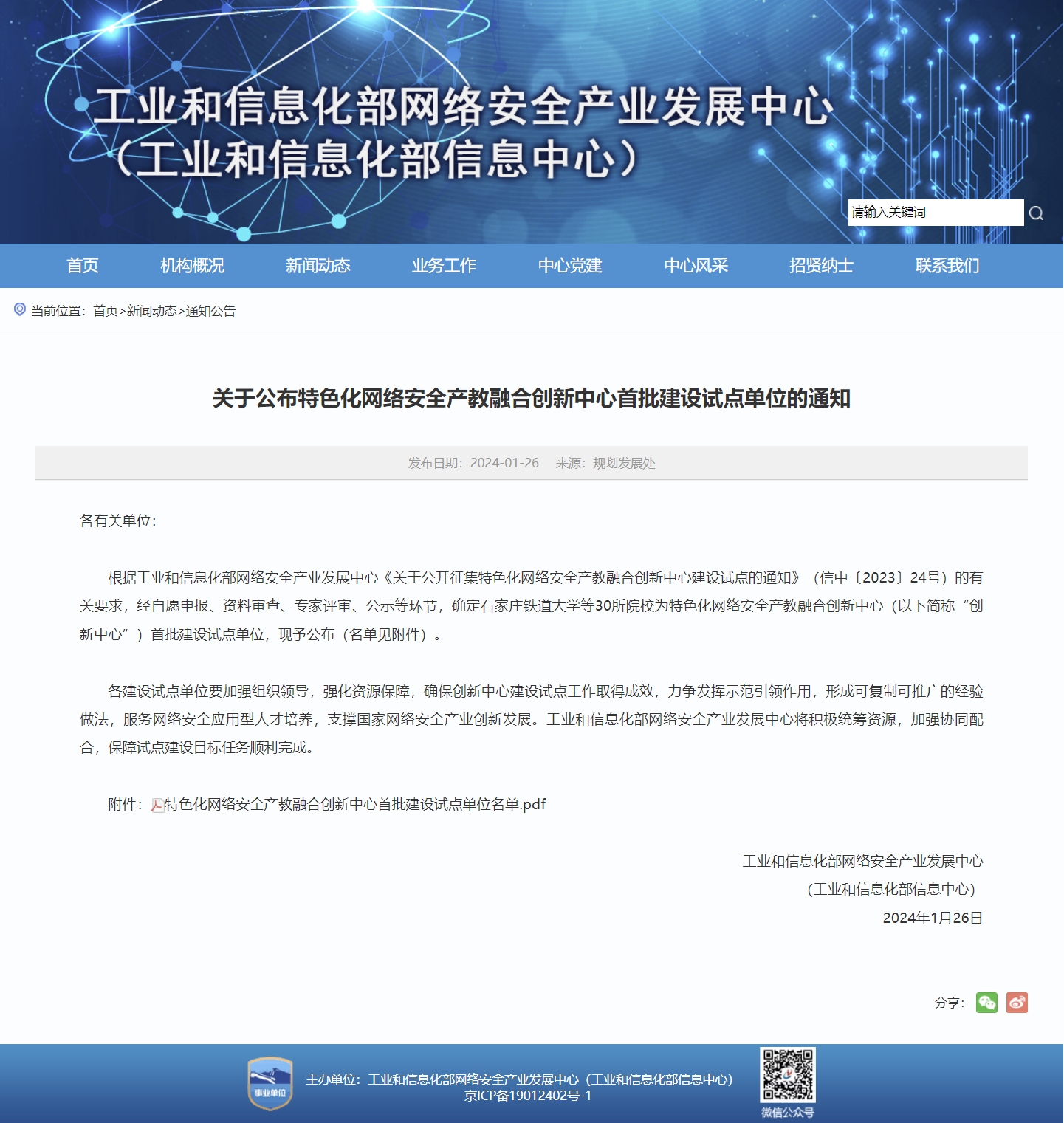 2024年1月19日,公司获批国家工业和信息化部特色化网络安全产教融合创新中心首批建设试点单位。