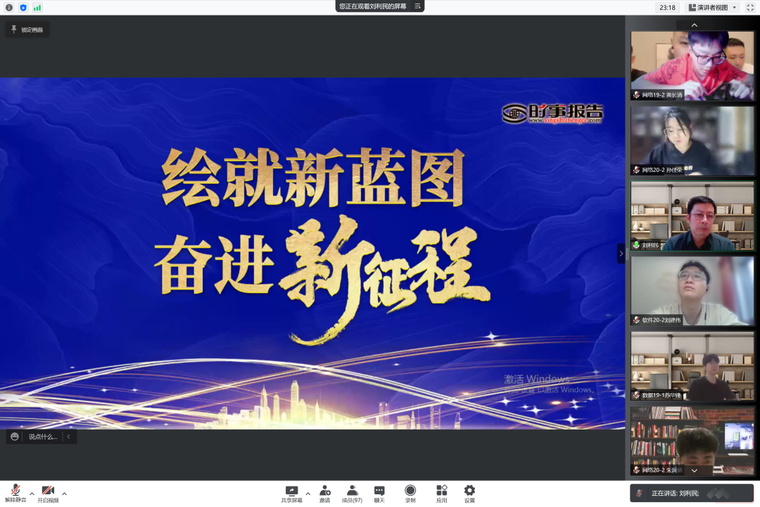 第一节党课由刘利民老师主讲,主题为“绘就新蓝图,奋进新征程”。刘经理从两个百年目标展开话题,围绕“胸怀两个大局,把脉发展阶段”、“肩负历史使命,擘画宏伟蓝图”、“保持战略定力,勠力同心前行”三个方向进行讲解,从擘画发展蓝图到规划实现路径,再到作出战略部署,刘经理都进行了细致的讲解。希望同学们要树立与时代主题同心同向的理想信念,勇于担当时代赋予的历史责任,励志勤学、刻苦磨炼,不忘初心,坚定听党话、跟党走的理想信念,肩负起实现中华民族伟大复兴的历史重任。