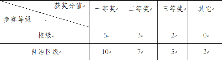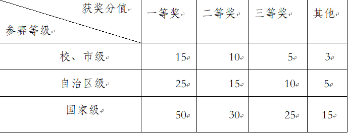 文体奖励是指研究生在校期间因参加自治区级或校级的比赛而获得的文体奖励分值。具体分值如下表所示: