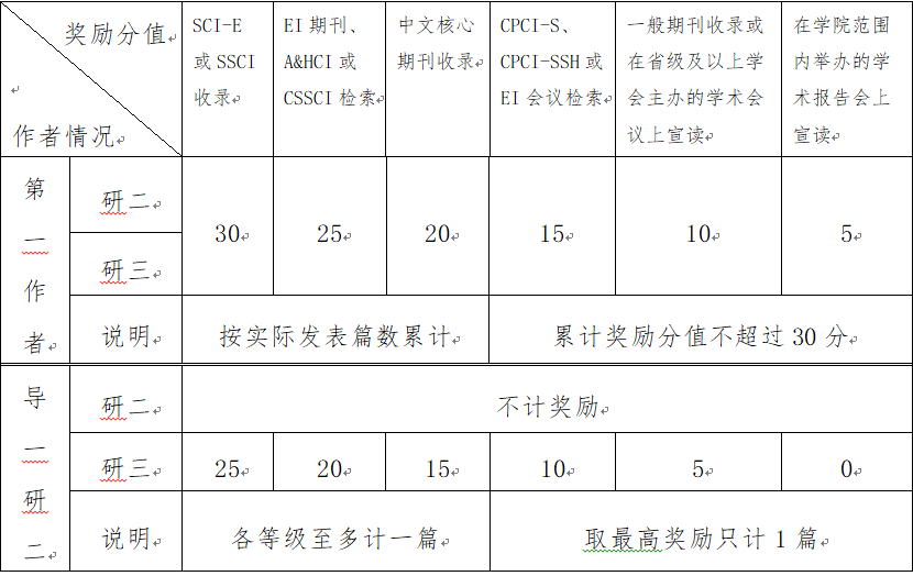 (1)发表论文奖励:按照发表论文的作者情况,只有以下两种可以加分:研究生为第一作者;导师为第一作者,研究生为第二作者(导一研二),具体奖励分值如下表:
