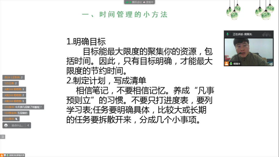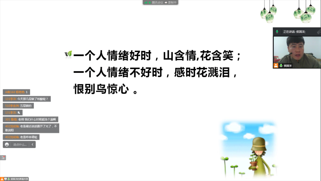 讲座中,侯老师列举了有效的时间管理和应对心理危机的小方法,希望同学们可以在疫情期间合理健康安排时间并对自我不良情绪进行调节。随后,侯老师讲解了健康情绪的标准并提出相关问题,同学们都认真思考并且踊跃抒发内心感想。最后,侯老师再次强调了班级心理委员与班委会成员的职责,要求大家加强与班级同学的联系,做到及时有效的沟通疏导。讲座结束后,同学们踊跃的提出问题,侯老师耐心的逐一进行了解答,同时对同学们展开关心和安慰。