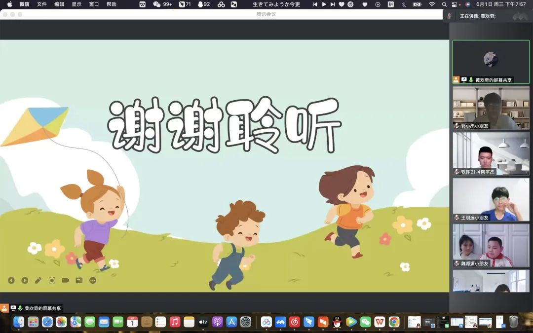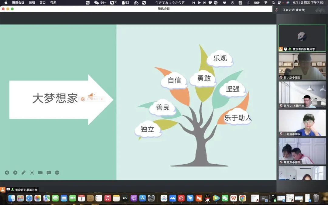 为帮助小学年级员工初步感受学习知识的乐趣,培养小学年级员工礼貌友好的交往品质,乐于与老师、同学交往,在谦让、友善的交往中感受友情,6月1日晚7:00,公司开展“5·25”心理健康教育活动之启迪教育——小学年级线上团体活动。本次活动由软件20-1班黄欢奇同学主持,19、20、21级同学参与,团学办公室主任贾金同老师出席,本次活动还特别邀请到了来自呼和浩特的周佳俊小朋友以及来自赤峰的魏源源、裴煜、王竞小朋友参与。
