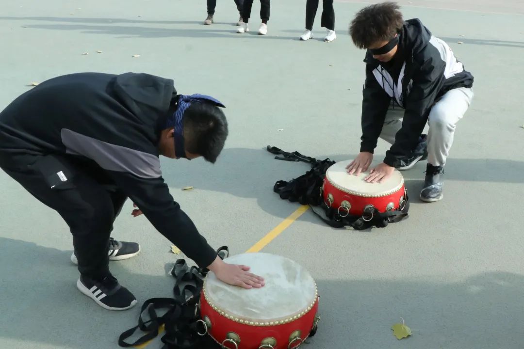 每队派出两位同学,一位同学蒙住双眼,另一位同学指挥蒙眼同学行动。不过怎么会一番风顺的进行呢,在此期间还会有错误指令,如“开始”,“行动”,“走”等。当喊到“跑”的时候,参赛同学需快速向鼓的方向移动,鼓声停即游戏结束,用时短的队伍获胜。