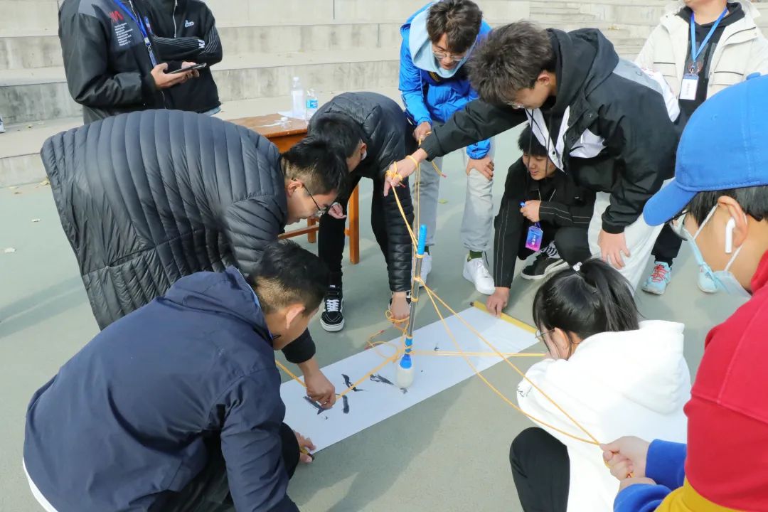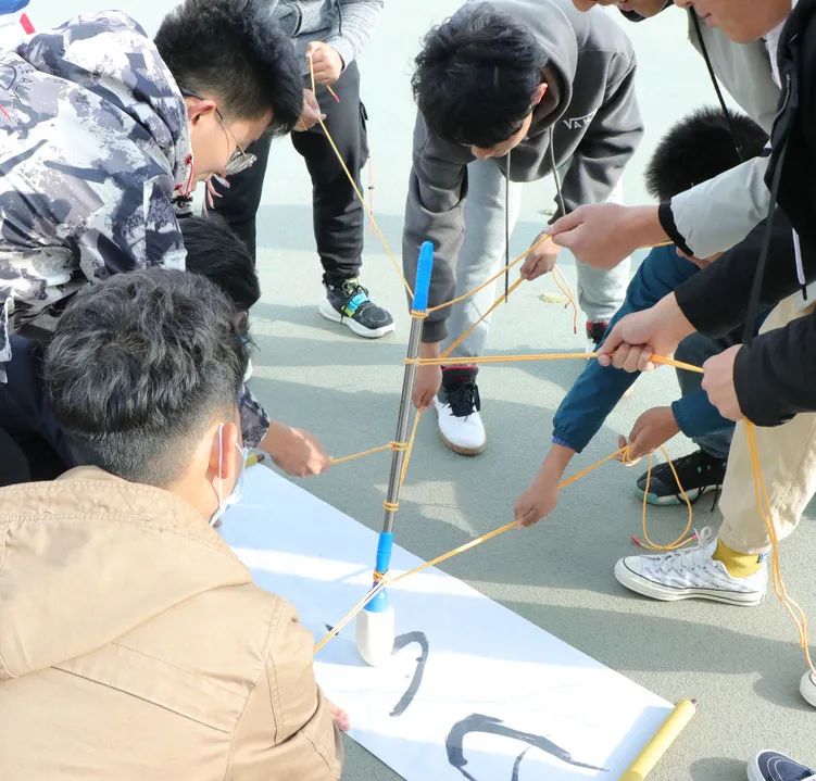 每队抽签决定书写的题目,控制连接毛笔的绳子,在布上按题目要求清晰书写题目内容。如果书写题目不正确或者不清晰,需重新书写。当然所消耗的时间也要计入总用时(逃不掉的~),最后用时短的队伍获胜。