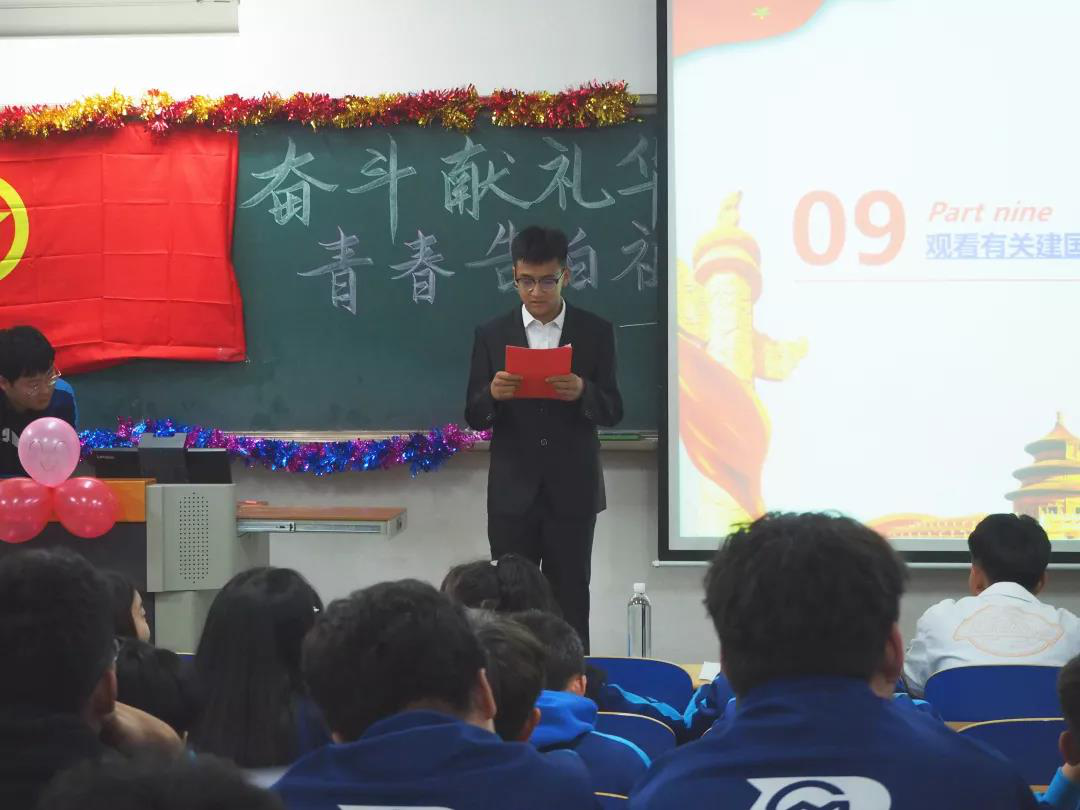 在祖国七十华诞来临之际,为积极响应上级团组织的工作部署,以及正确引导当代青年树立正确的奋斗目标,数据18班团支部于10月17日集中开展以“奋斗献礼华诞,青春告白祖国”为主题的团日活动。