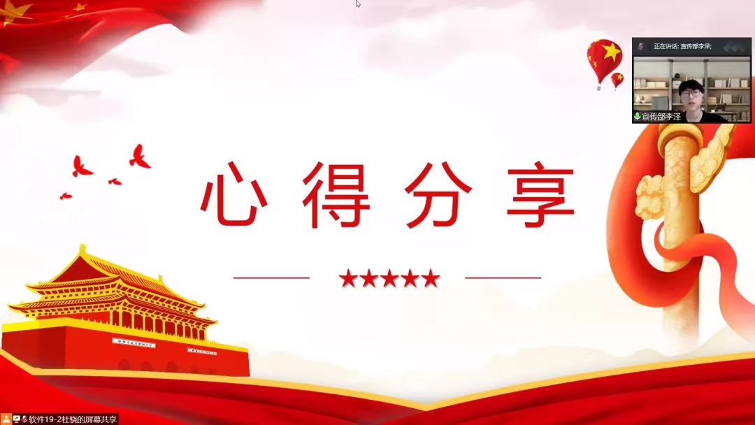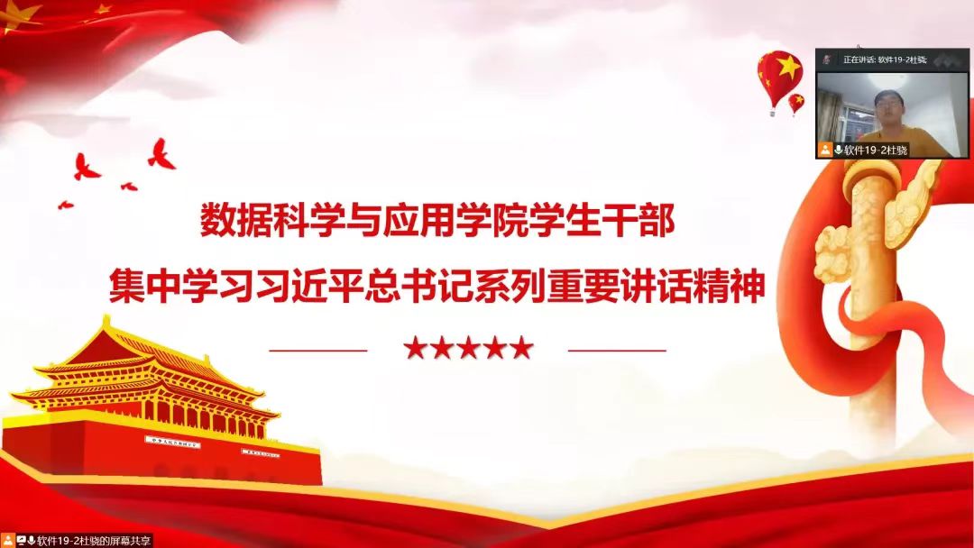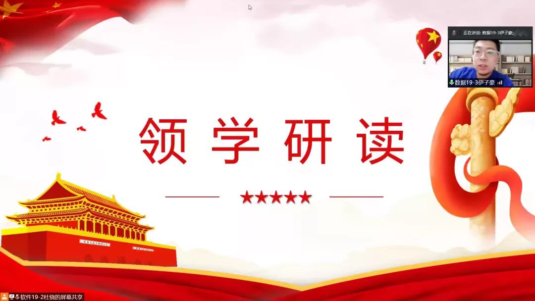 李文阳同学、伊子豪同学和杜骁同学分别领学了《习近平总书记在中国人民大学考察时的重要讲话》、《习近平总书记在庆祝中国共产主义青年团成立100周年大会上重要讲话》等内容。习近平总书记强调要坚持党的领导,传承红色基因扎根中国大地,希望广大青年牢记党的教诲,励志民族复兴。