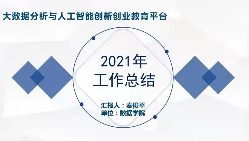 秦俊平老师首先从“大数据分析与人工智能”创新创业教育平台重点工作完成情况、突出成绩和亮点工作三个方面介绍了2021年“平台”工作完成情况,重点突出了平台创新创业教育举措与效果。“平台”的工作目标为推进人才培养模式改革,培养特色创新人才;促进员工个性发展,提升创新意识与创新能力。“平台”的工作思路为以创新创业教育教育为基础、以创新创业教育训练为手段、以创新创业教育实践为升华。随后,结合“平台”实际,从教师队伍、课程建设、员工专业三个方面介绍了目前存在的主要问题,并对2022年工作提出了思考与建议。