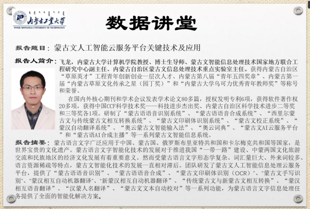 飞龙教授长期从事蒙古文信息处理、语音识别、语音合成和语义理解的研究工作,突破了面临的技术瓶颈,提出相关创新性方法,并研发了蒙古语语音识别与合成、蒙古文校正、新蒙古文与传统蒙古文相互转换、蒙古文智能输入法和蒙古语AI合成主播等一系列蒙古文智能信息处理系统,填补了蒙古文智能信息处理领域的多项空白,为资源稀疏和黏着语特性的语言文字智能信息处理相关技术提供了理论依据,对少数民族语言智能信息化和内蒙古自治区智能信息产业的发展起到了重要的推动作用,对传承与保护蒙古语言文字与特色文化,促进民族团结进步和中蒙两国文化旅游交流,推进“一带一路”建设具有重要意义。已发表论文70多篇,其中SCI和EI检索论文41篇,以第一作者和通讯作者在TASLP、ICASSP等著名学术期刊和会议上发表高水平论文17篇。以第一完成人授权发明专利4项,成果获得2020年度“CCF科学技术奖”——科技进步杰出奖和2016年度内蒙古自治区科学技术进步二等奖各一次。先后主持了国家和自治区级科研项目13项,其中国家自然科学基金项目2项、国家重点研发计划——政府间国际科技创新合作重点专项子任务1项、内蒙古自治区关键技术攻关计划项目2项、内蒙古蒙古语言文字信息化专项扶持项目1项。2017年被评为内蒙古自治区“草原英才”工程青年创新创业一层次人才,2018年获得内蒙古自治区第八届“内蒙古青年五四奖章”和内蒙古自治区第一届“内蒙古草原文化传承之星(园丁奖)”称号。2018-2020年连续三年被评为国家和自治区级“互联网+”老员工创新创业大赛优秀创新创业导师。指导的员工多次获得“互联网+”老员工创新创业大赛、“创青春”内蒙古青年创新创业大赛和全国“挑战杯”老员工课外学术科技作品竞赛的国家级和自治区级奖项,如指导的员工在2018、2019和2020年的中国“互联网+”老员工创新创业大赛内蒙古赛区总决赛中均获得金奖,在全国比赛中均获得铜奖。