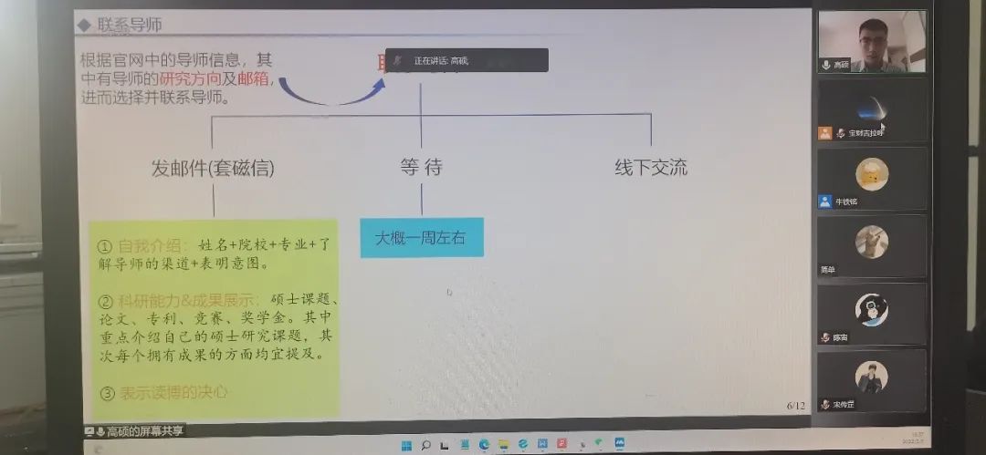 研三高硕针对目前想要读博的同学给出了一些建议,可以在每年的10月份根据公司的官网中导师信息进行选择并联系导师,在和导师取得联系后可尝试线下交流,以学术交流为主可事先准备自己擅长的科研领域,交流中要始终体现一种科研人员的素质。