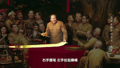 龙凤宫灯下,毛主席正站在铺着红布的方桌前,笑容可掬,微微扭头,右手提笔、左手拉起横幅,微笑着望着柳亚子,柳亚子抬手表示赞叹欣赏。朱德、刘少奇、周恩来等领导人聚拢在桌边,谈诗论句,兴味正浓。