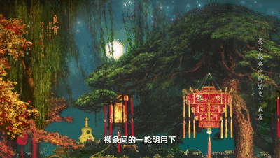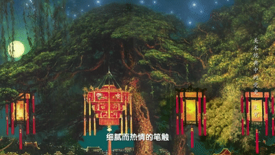 画家辟出左侧一角,展现中秋和谐优美的夜色,柳条间的一轮明月下,北海的白塔镶嵌在宝石蓝色的夜幕中,白塔四周灯光点点,勾勒出古代建筑的轮廓,与天上闪烁的繁星遥相呼应。