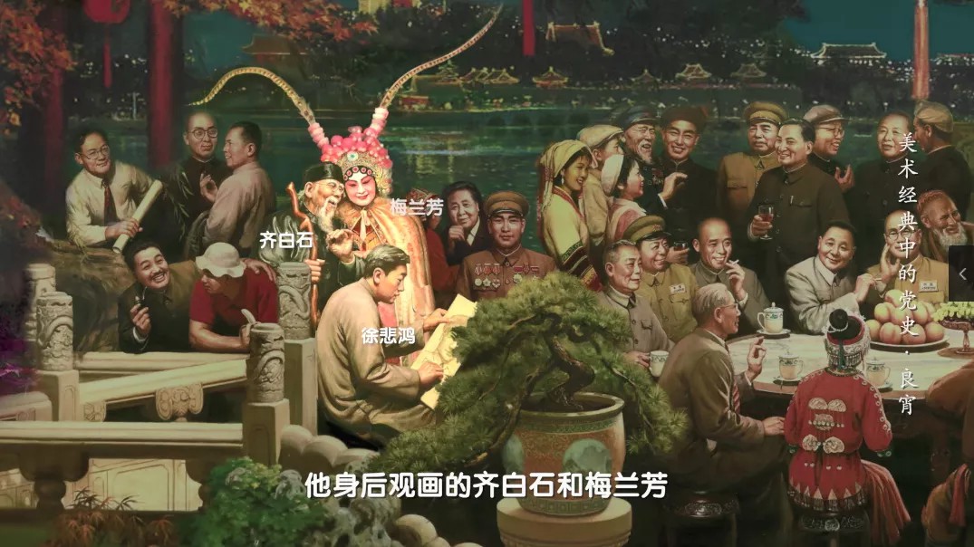 在圆桌左侧的文艺界代表中,正在作画的徐悲鸿和他身后观画的齐白石、梅兰芳,展现出各自的风采。