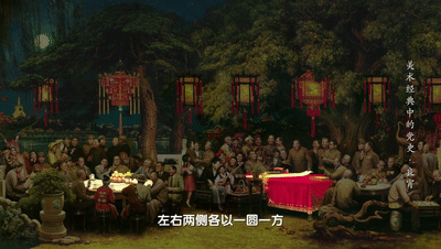 两张桌子在宫灯光源的照射下,光线最为集中,在白色桌面和宣纸的映衬下,主要人物的面容轮廓更加清晰、突出。