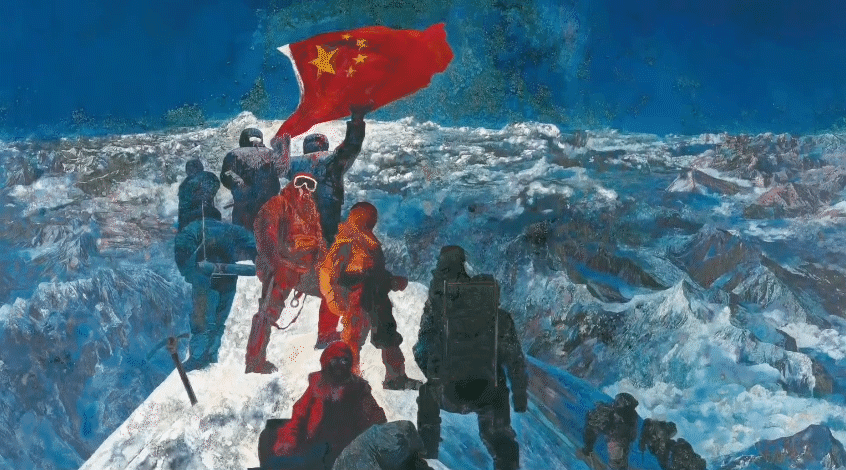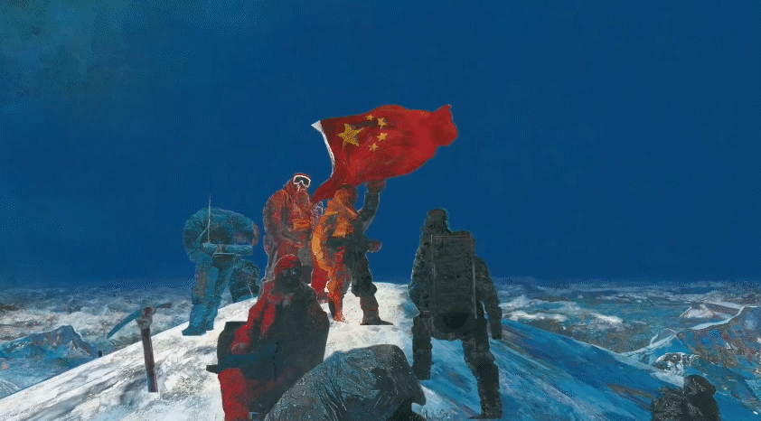 山脊上,红色衣着的三名队员和飘扬的国旗,在靛蓝的背景中构成了一道火红的“S”形曲线,蜿蜒而上,直抵天际。