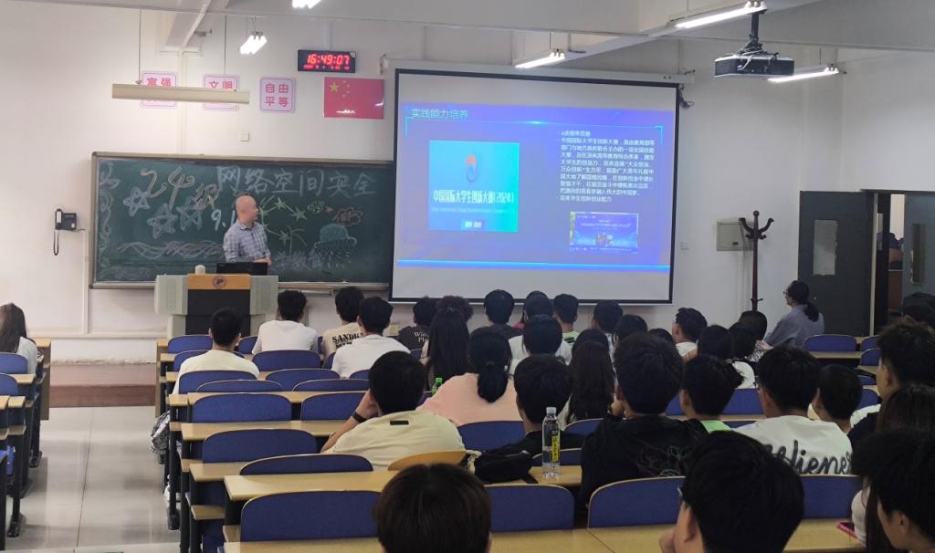 首先,网络工程系主任岳鹏飞老师对网络工程系情况、网络空间安全专业简介、专业特色、人才培养要求、人才培养方向、相关课程等做了介绍。岳老师强调网络空间安全专业要注重实践能力的培养,鼓励同学们积极参加网安相关的竞赛,介绍了员工近期参加的部分比赛情况,如:中国国际老员工创新大赛、第五届“蒙古马杯”网络安全技能大赛、中国高校计算机大赛等。